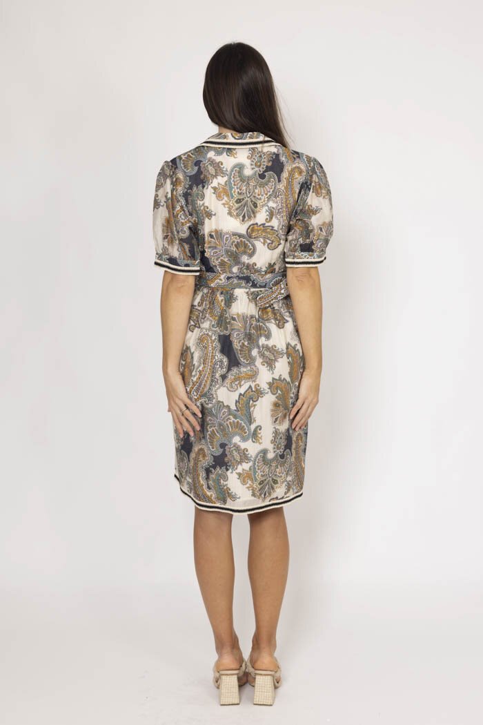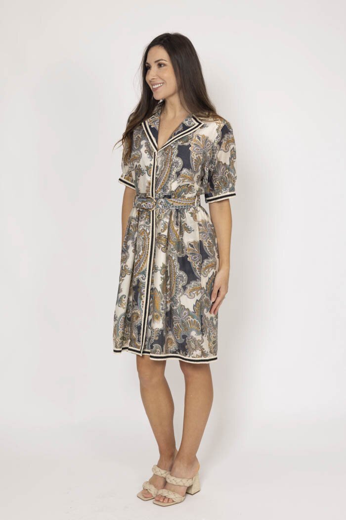 A short sleeve shirt dress in a soft paisley cream fabric with thick waist belt.