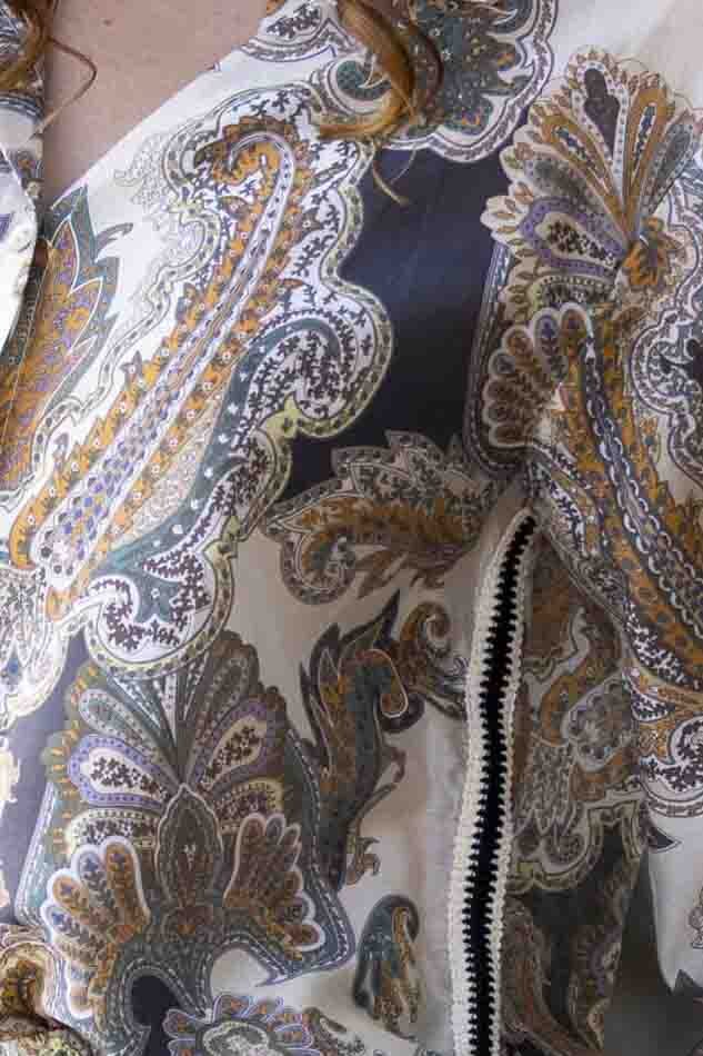 A soft paisley cream fabric shirt with a touch of black and white stripe detailing on the cuffs and collar.