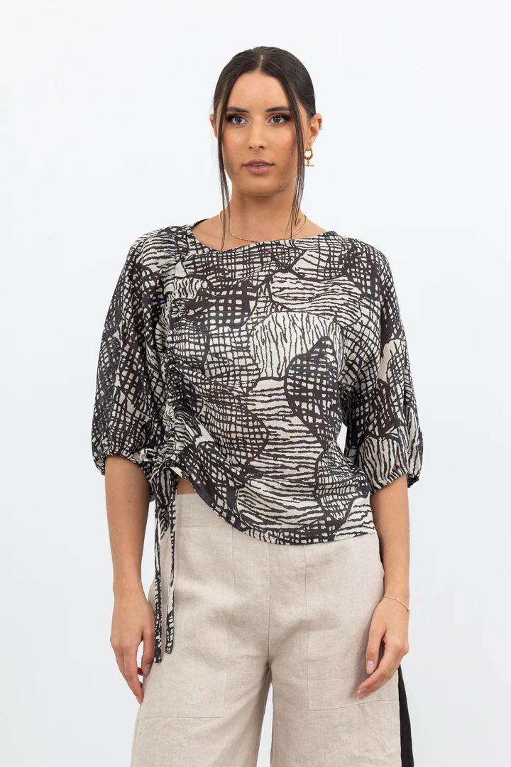 The Pixelated Pattern Top is a bold, art-inspired piece that brings texture and movement to your wardrobe. The relaxed silhouette is elevated with a side drawstring detail that allows you to create soft ruching and adjust the shape to suit your style. Half-length sleeves with subtle volume add a touch of drama, making it perfect to pair with tailored linen trousers or casual denim for an effortlessly chic look.