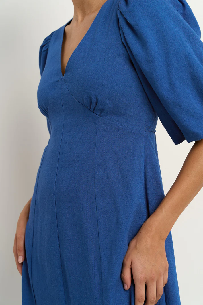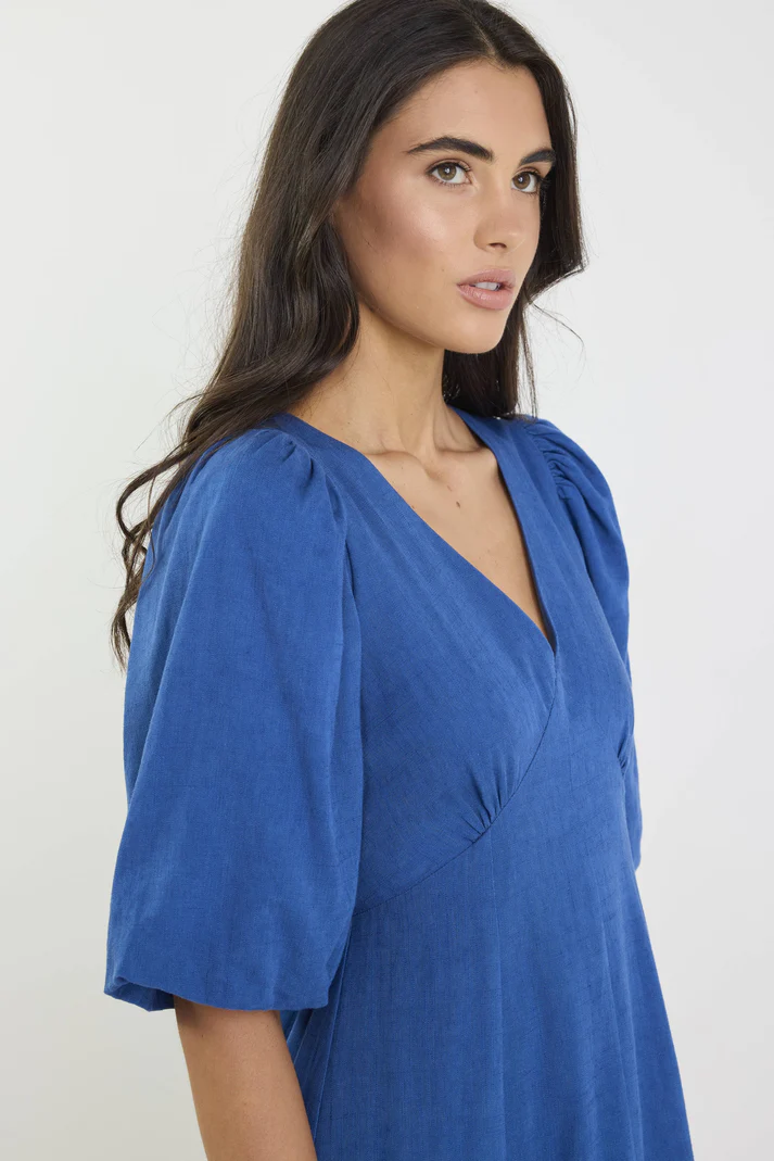 Effortlessly elegant this true blue maxi dress is a dreamy addition to your wardrobe. The flowing silhouette, deep V-neckline, and soft puff sleeves create a flattering, feminine shape, while the abstract print brings a modern edge. Styled with sneakers for an off-duty vibe or elevated with heels, this dress is an instant statement-maker.
