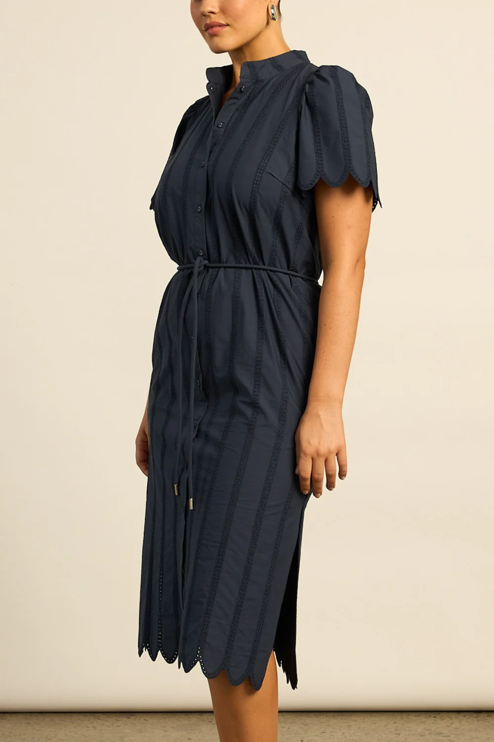 crafted in cotton poplin broderie, the portside dress is shaped with precision. linear broderie creates a modern and flattering aesthetic. a scalloped hem and cuffs add refinement and versatility.