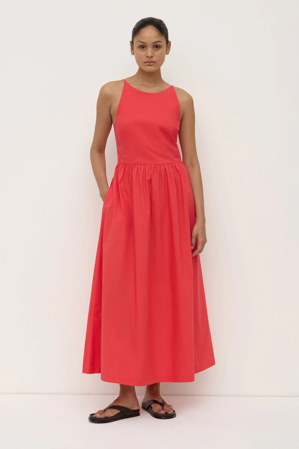 Crafted from our signature cotton poplin, this sleeveless maxi dress is designed for day-to-night wear, featuring a fitted bodice and ankle-length skirt with side pockets for added utility.