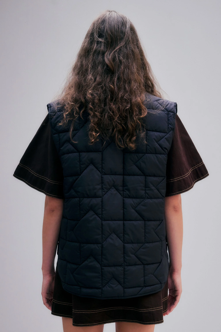 Exclusive to Karen Walker, the Quilted Monogram Vest is a versatile layering piece in a sleeveless silhouette. Crafted from 100% recycled polyester with a lightweight vegan padded fill, it layers easily over shirts and knitwear for warmth without weight. Featuring all-over KW monogram quilting, the design brings subtle texture and brand detail to a clean, modern silhouette.