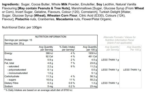 A truly decadent treat. Light, fluffy marshmallows, Turkish Delight, cranberries, pistachios and macadamias blended with creamy Belgian white chocolate, sprinkled with organic dried rose petals and presented in a beautiful clear sleeve with luxury ribbon bows on each end.