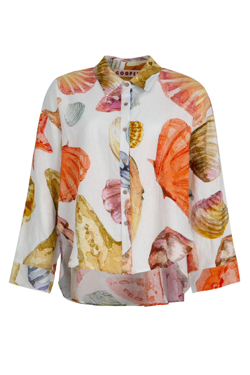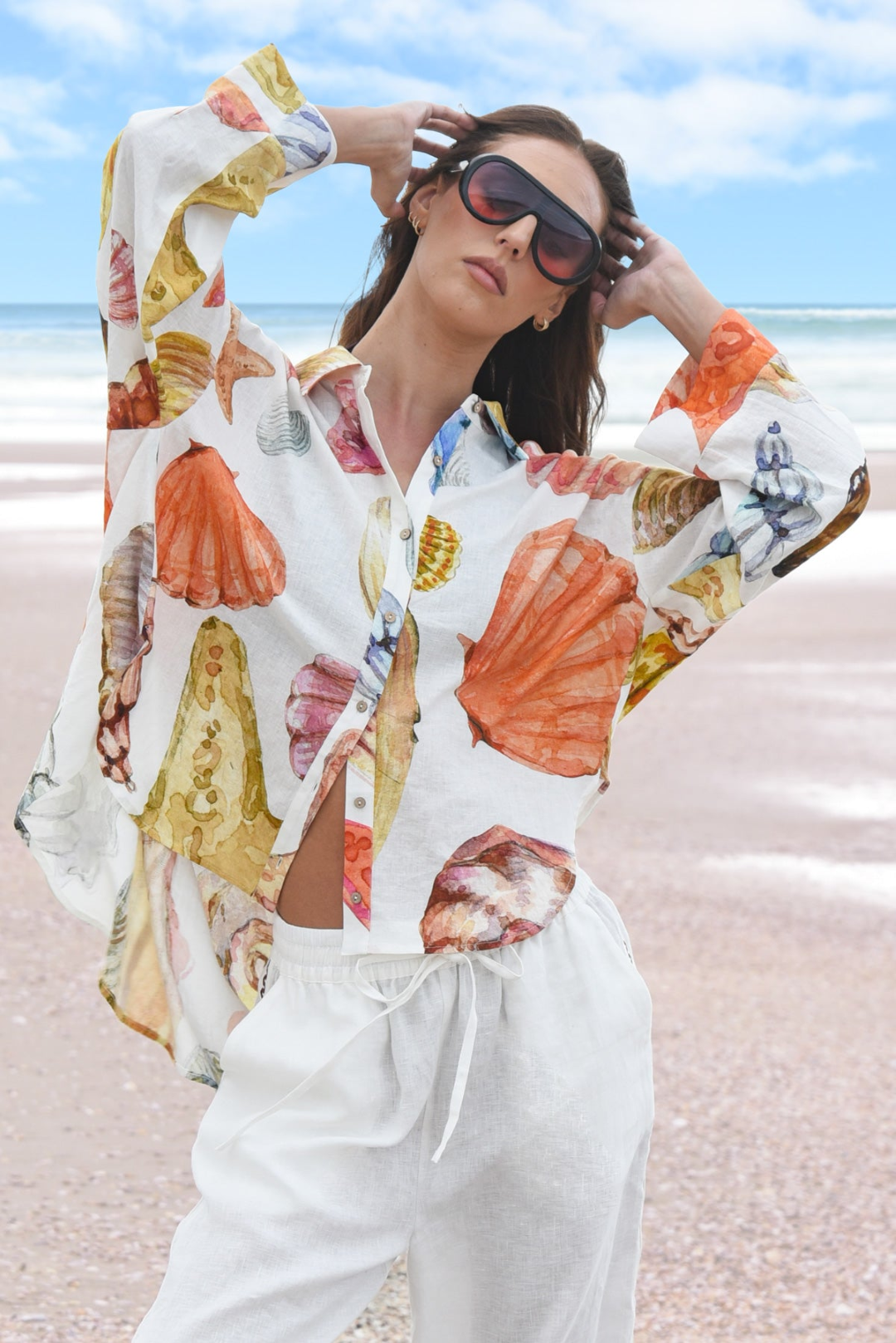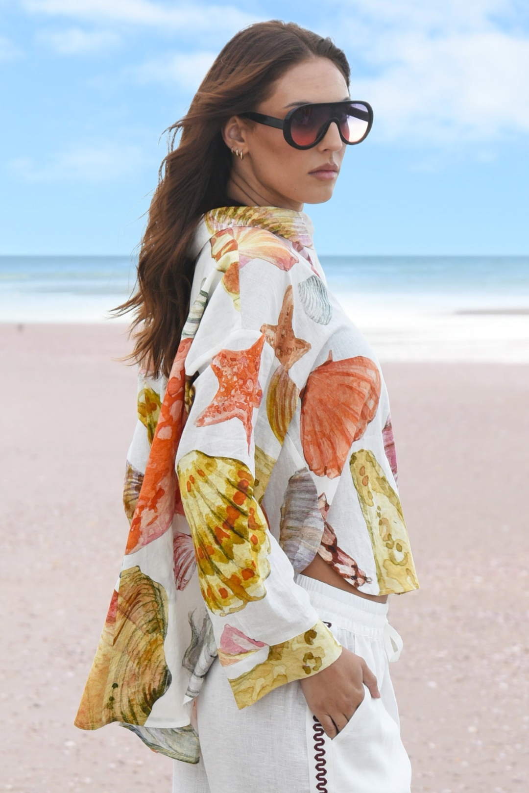 Utilise effortless summer styling with the ‘Room with a View’ shirt. An easy throw-on piece perfect for every day use, it features a semi-cropped boxy fit, and high-low contoured hemline. Button through design to be worn buttoned up or down, you’ll want to add the ‘Shell will be Loved’ fabrication in your wardrobe, for a playful and vibrant boost of colour.