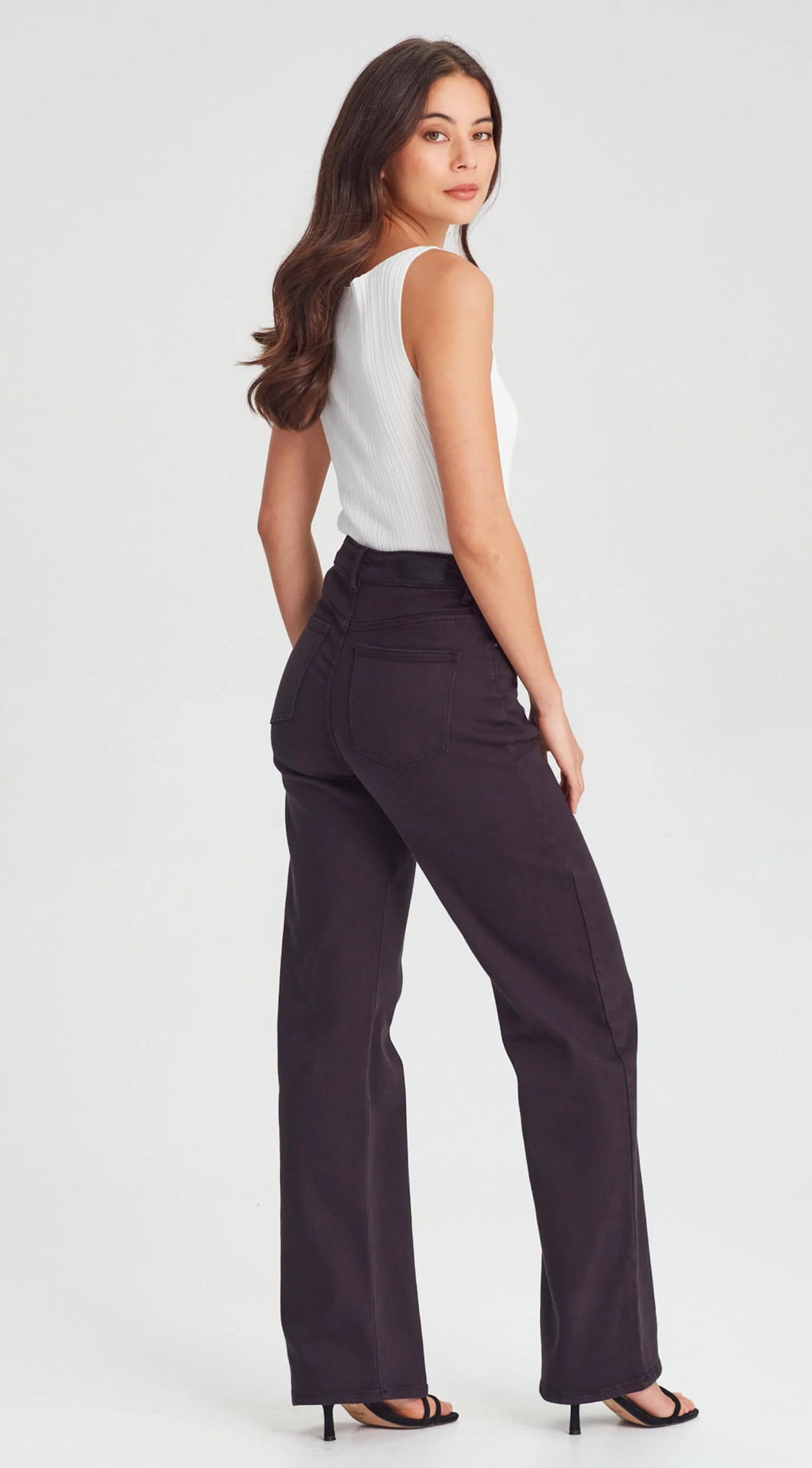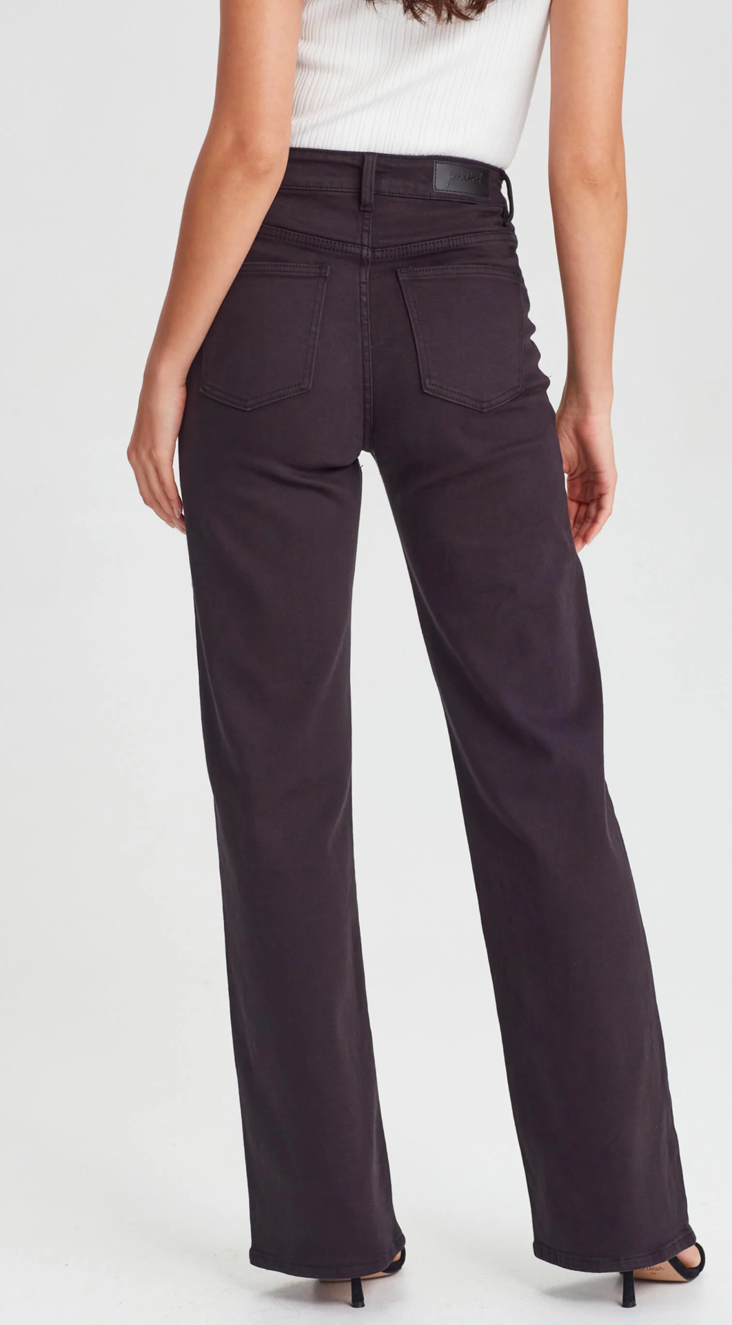High waisted, straight to wide leg jean in a soft stretch fabric.