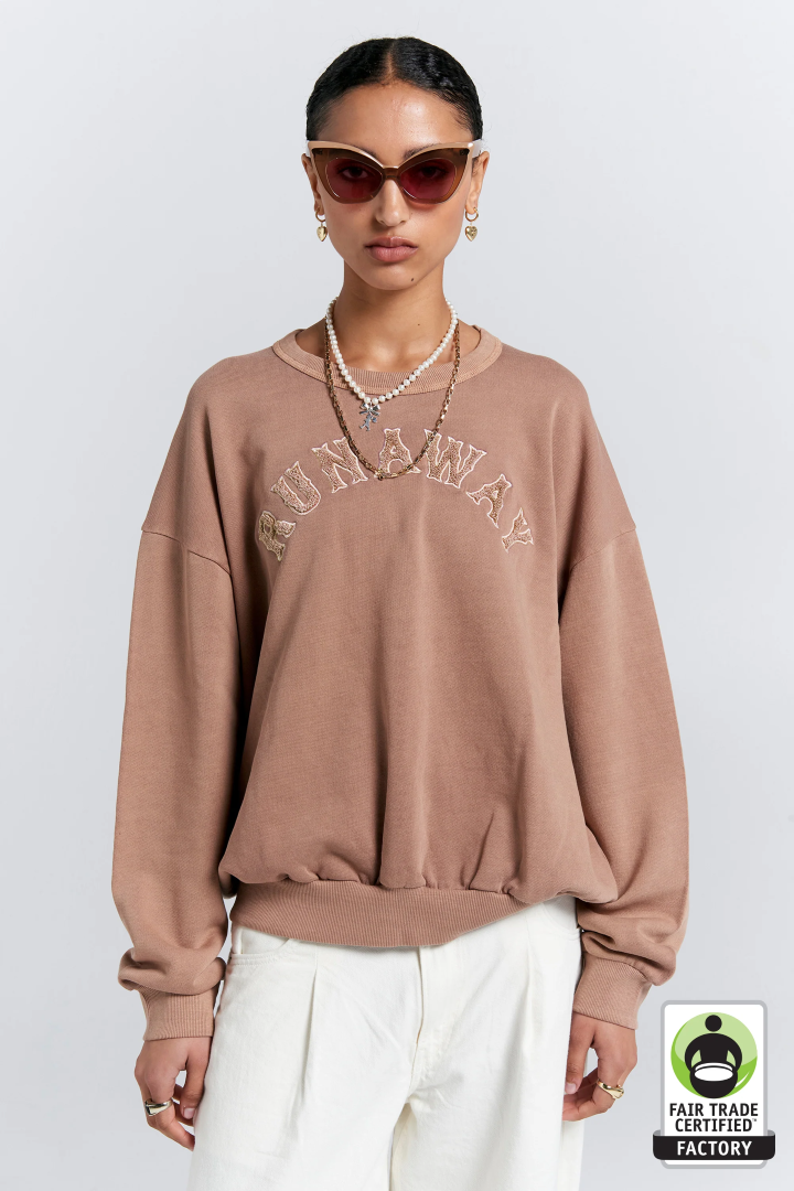 The Runaway College Organic Cotton Crewneck Sweatshirt combines comfort and style in a classic silhouette. With its loose, relaxed fit, this drapey sweatshirt offers the perfect blend of cosiness and effortless flair. Embroidered with an arched “Runaway” slogan in a college font, this piece adds a spirited touch to your collection of staples.