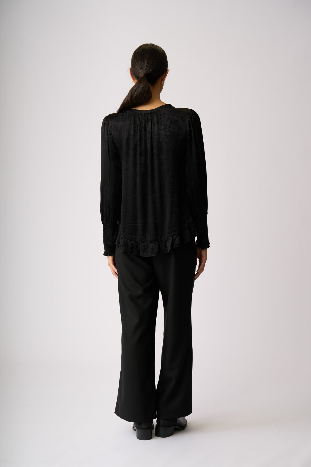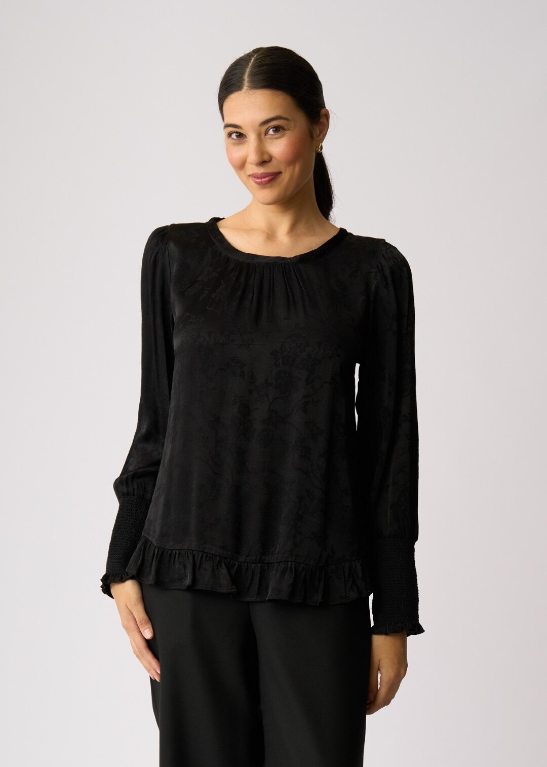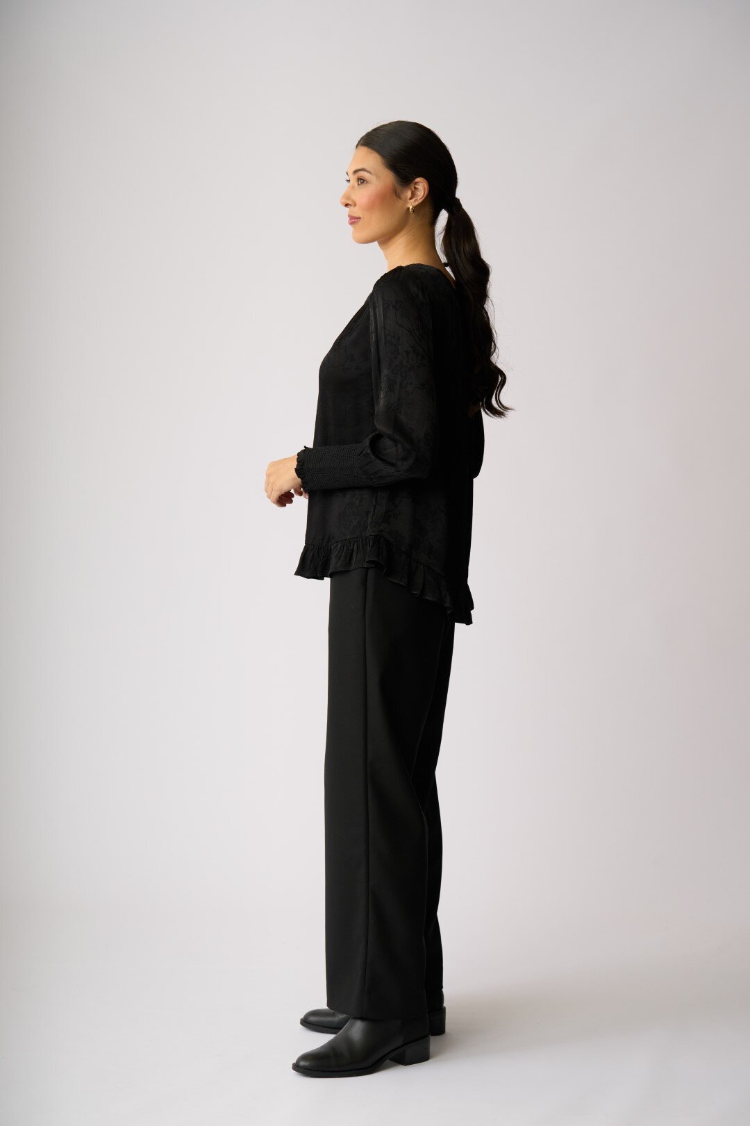 Ruffle detail, scoop hem top.