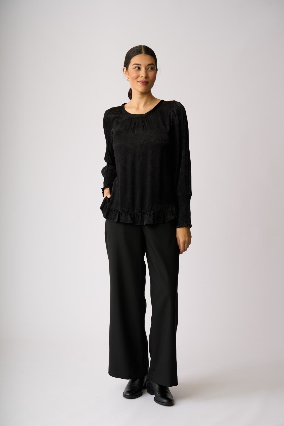 Full length sleeve featuring a long shirred elastic cuff.