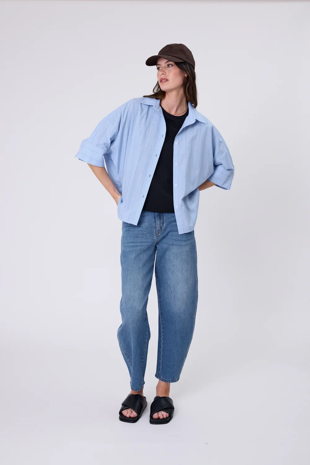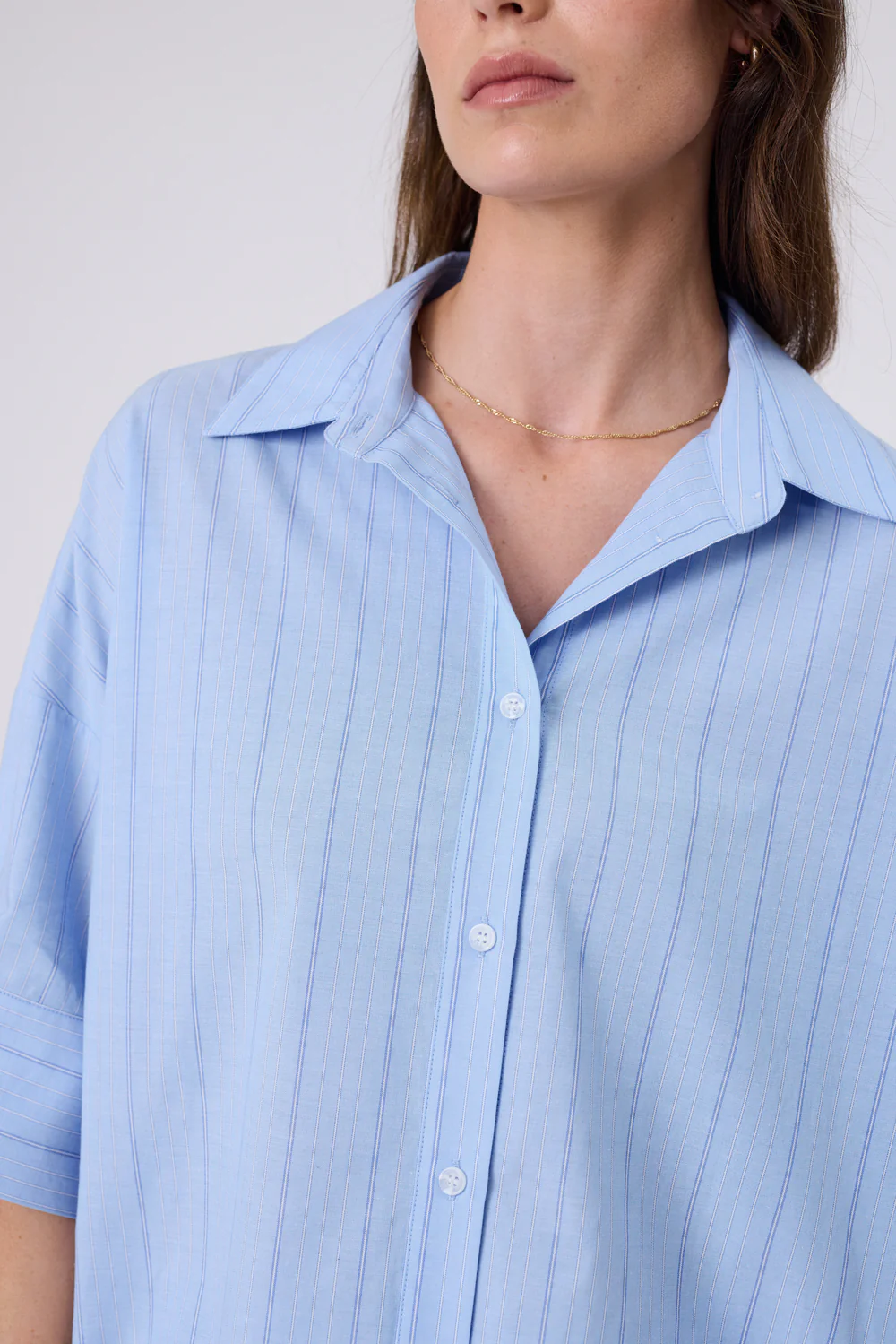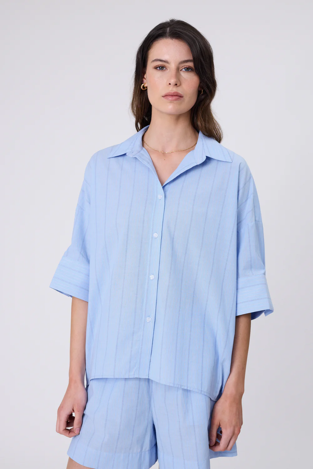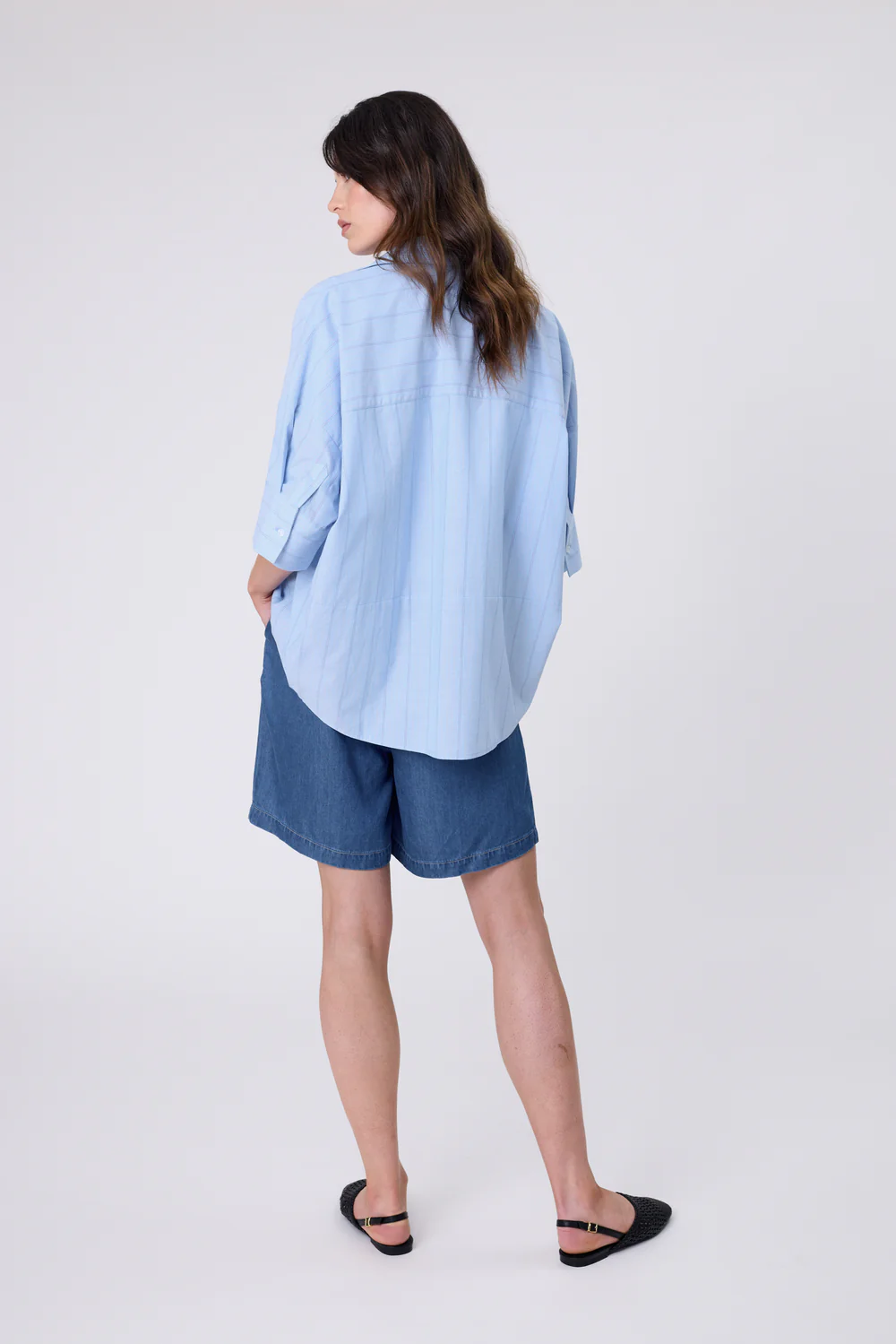A twist on a classic, the Shoreline Short in Blue Stripe is a must-have for easy summer styling. Features an oversized, boxy fit with dropped shoulders and half sleeves finished with a wide cuff. Lightweight and breathable, this shirt is crafted in a custom yarn-dye stripe. The back yoke and seam details add subtle structure and volume, and the curved high-low hem creates a flattering shape. Versatile and easy to style, wear it buttoned up for work, open as a lightweight layer, or paired with the matching Shoreline Short for effortless summer outfitting.