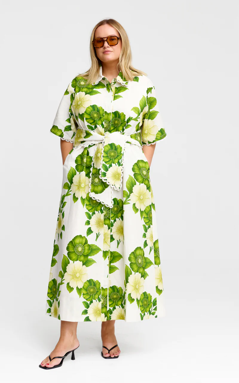 The Sierra Dress is a classic Kinney shirt-dress shape, adorned with our new scallop trim detail. The wide statement belt elevates this design, making it perfect for any event. Other design details include in-seam pockets, a double leaf collar and concealed button stand.