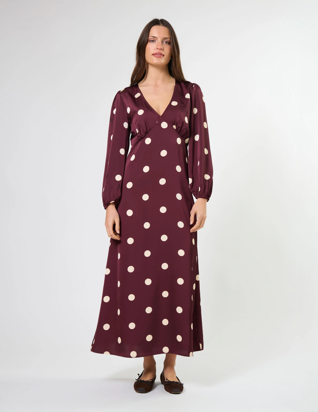 V neck maxi dress with gathering on bust seams and bias skirt.
