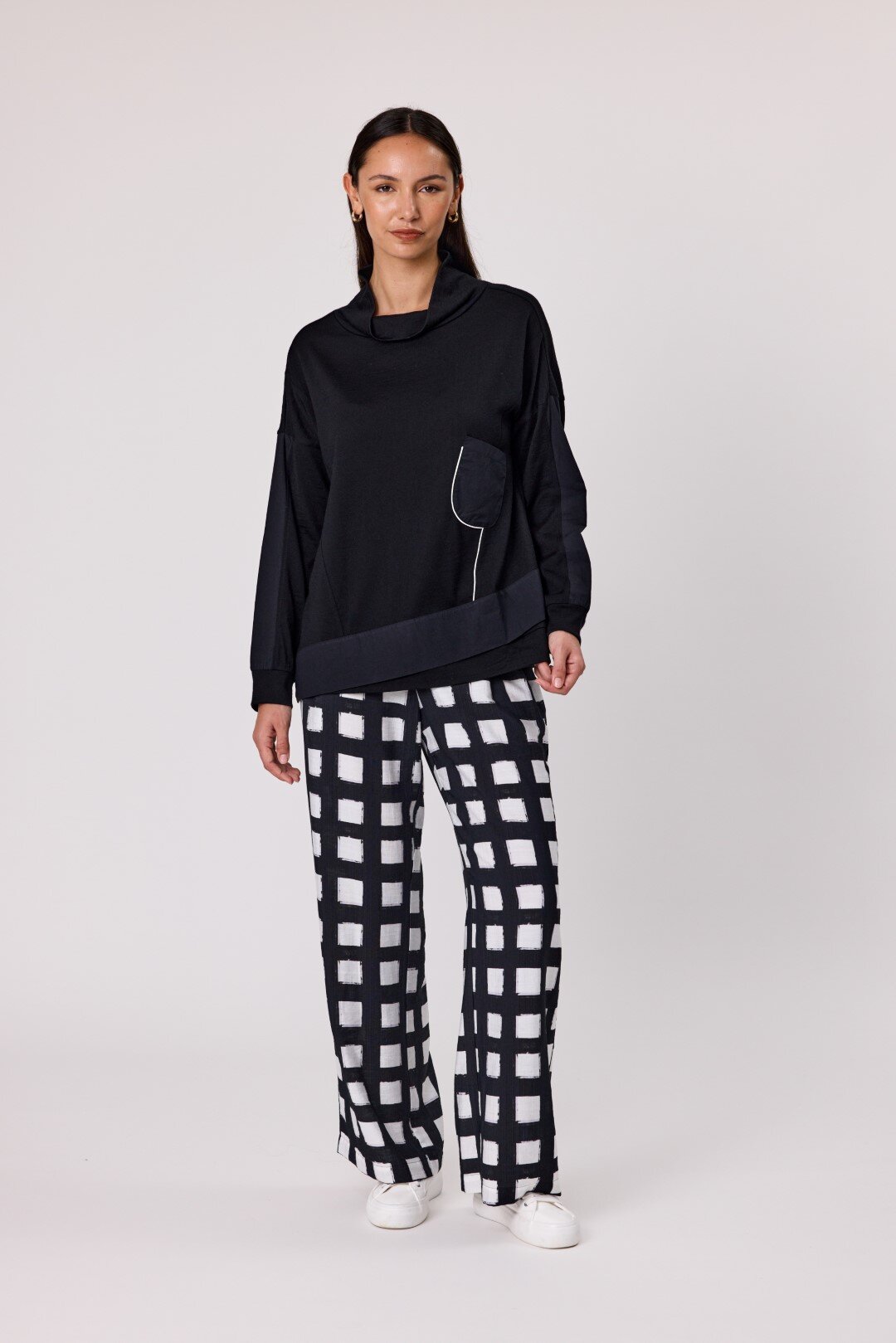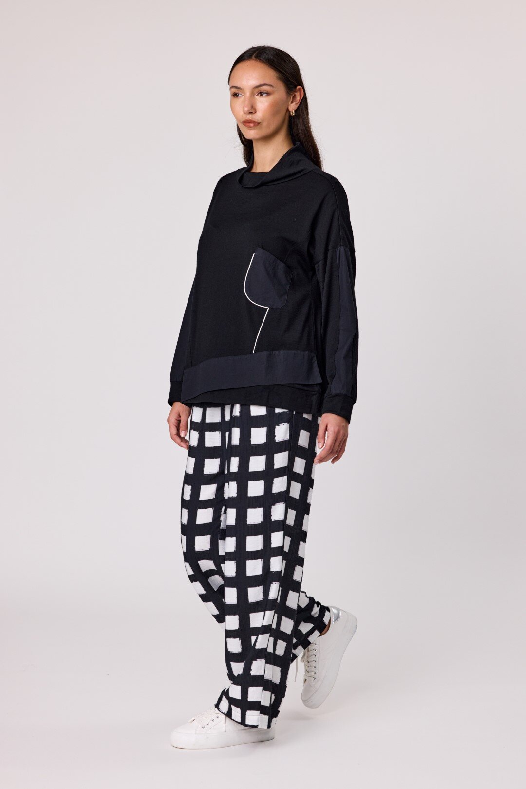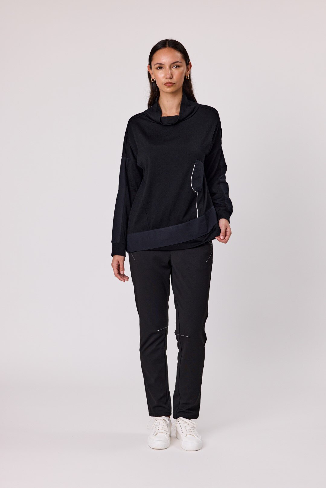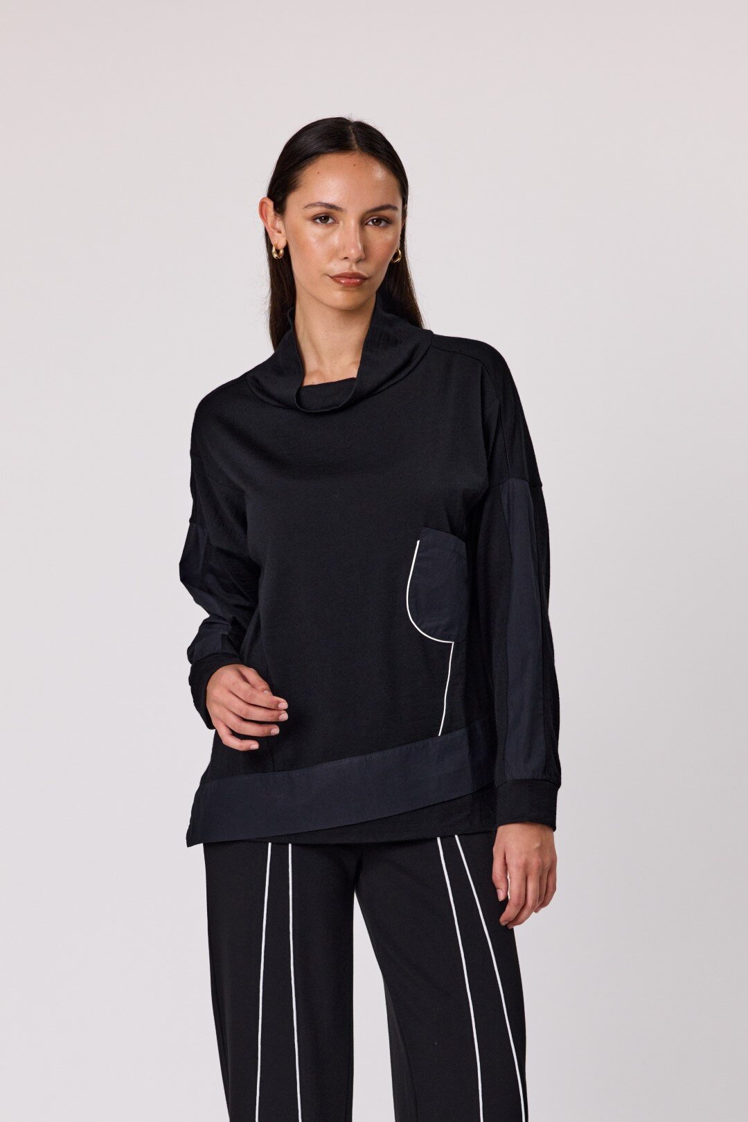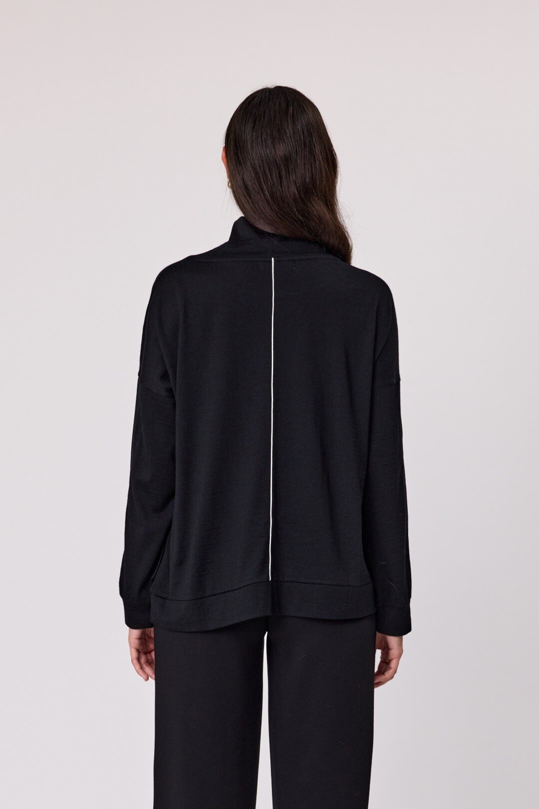 Stay cozy and stylish with this elegant black merino wool top.Made from merino wool, it offers warmth, breathability, and a soft touch. Small pocket at front with contrast trim for a pop of detail. Long sleeves for full coverage and layering ease.