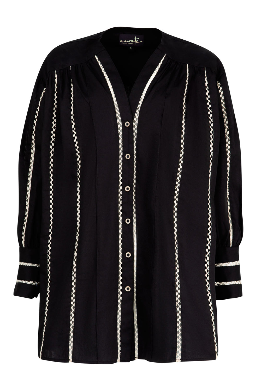 Make a statement in the Stop the Press shirt, crafted from crisp Get the Look cotton. Oversized for effortless comfort, it features a V-neckline, button-through front, and gathered back for subtle shape. Delicate embroidered lattice inserts and fixed cuffs with button closure add refined detail, blending relaxed ease with thoughtful tailoring.