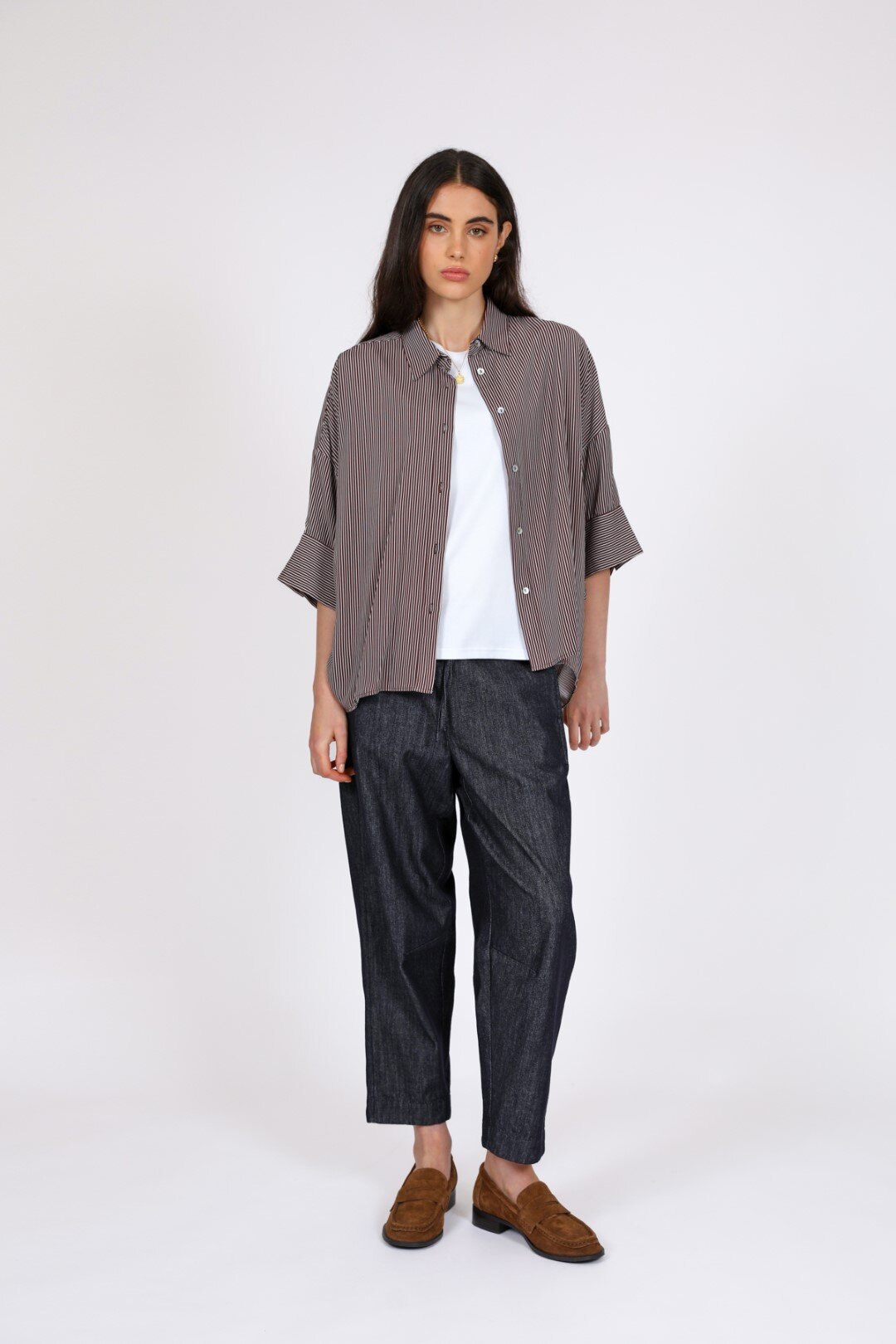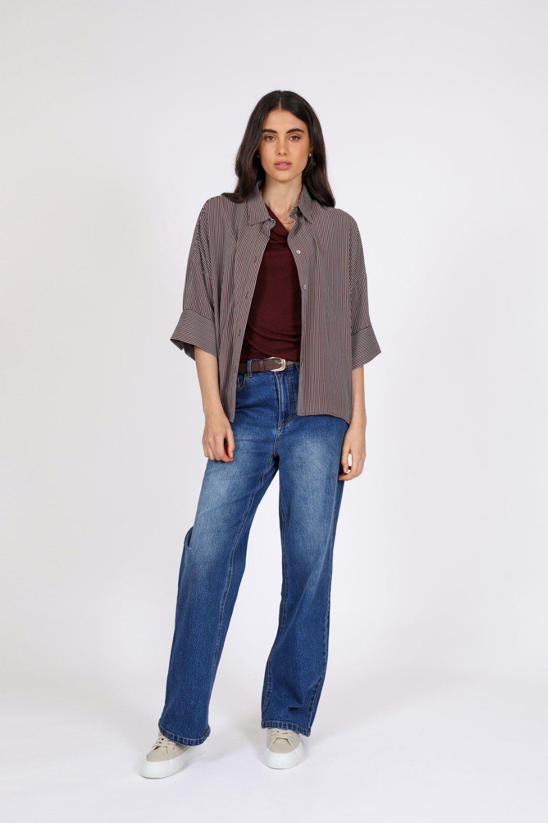 Embrace effortless Autumn styling with our Strand Shirt in Java Stripe. A contempor ary take on a classic button - up shirt, it f eatures an oversized, boxy fit with dropped shoulders and half sleeves, finished with a wide cuff. Crafted from Rayon, this shirt offers breathable comfort, with beautiful drape and a silky hand - feel. The back yok e and seam details add subtle structure and volume, and the curved high - low hem creates a flattering shape. Versatile and easy to style, wear it buttoned up for work, or open as a layering piece.