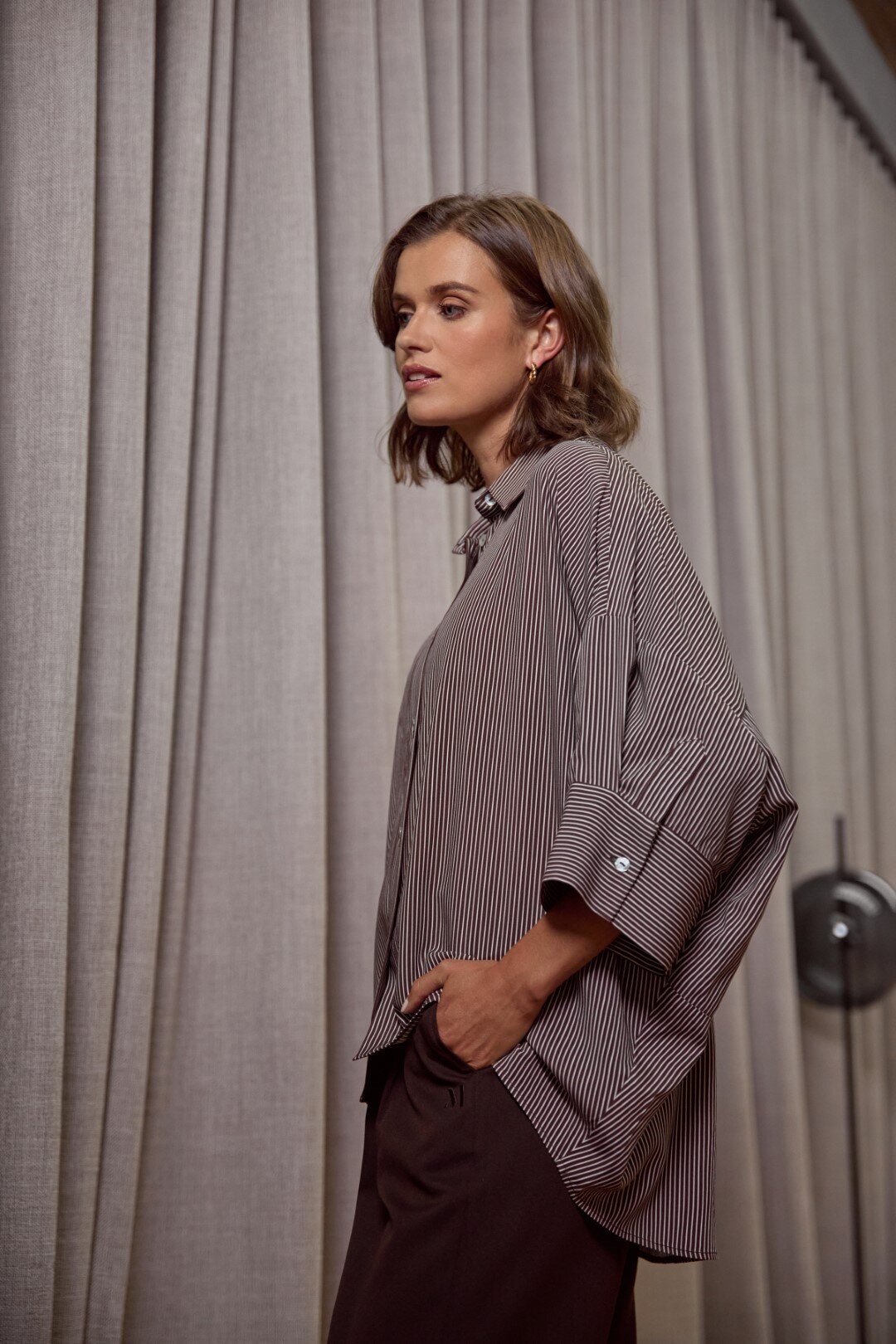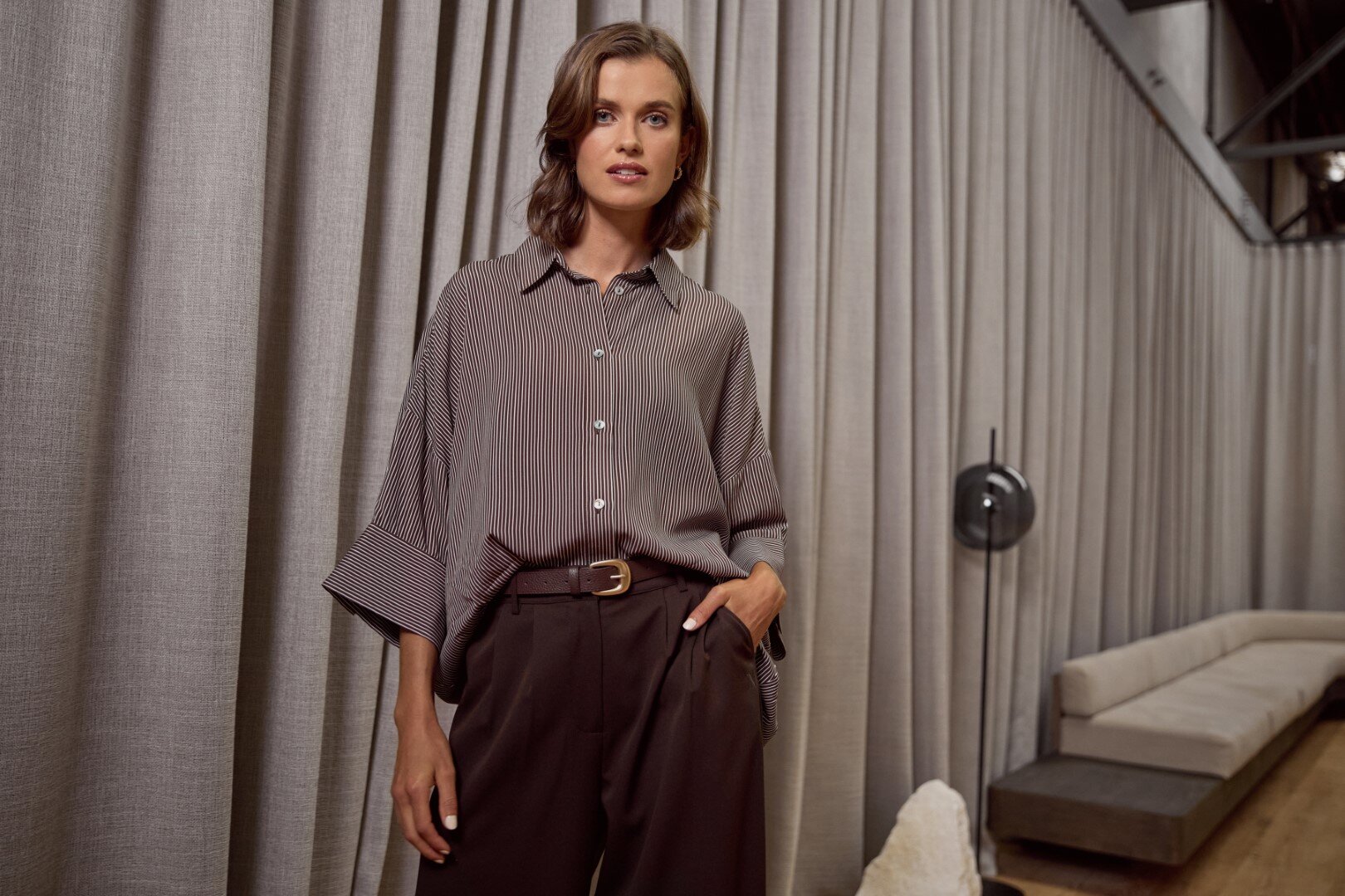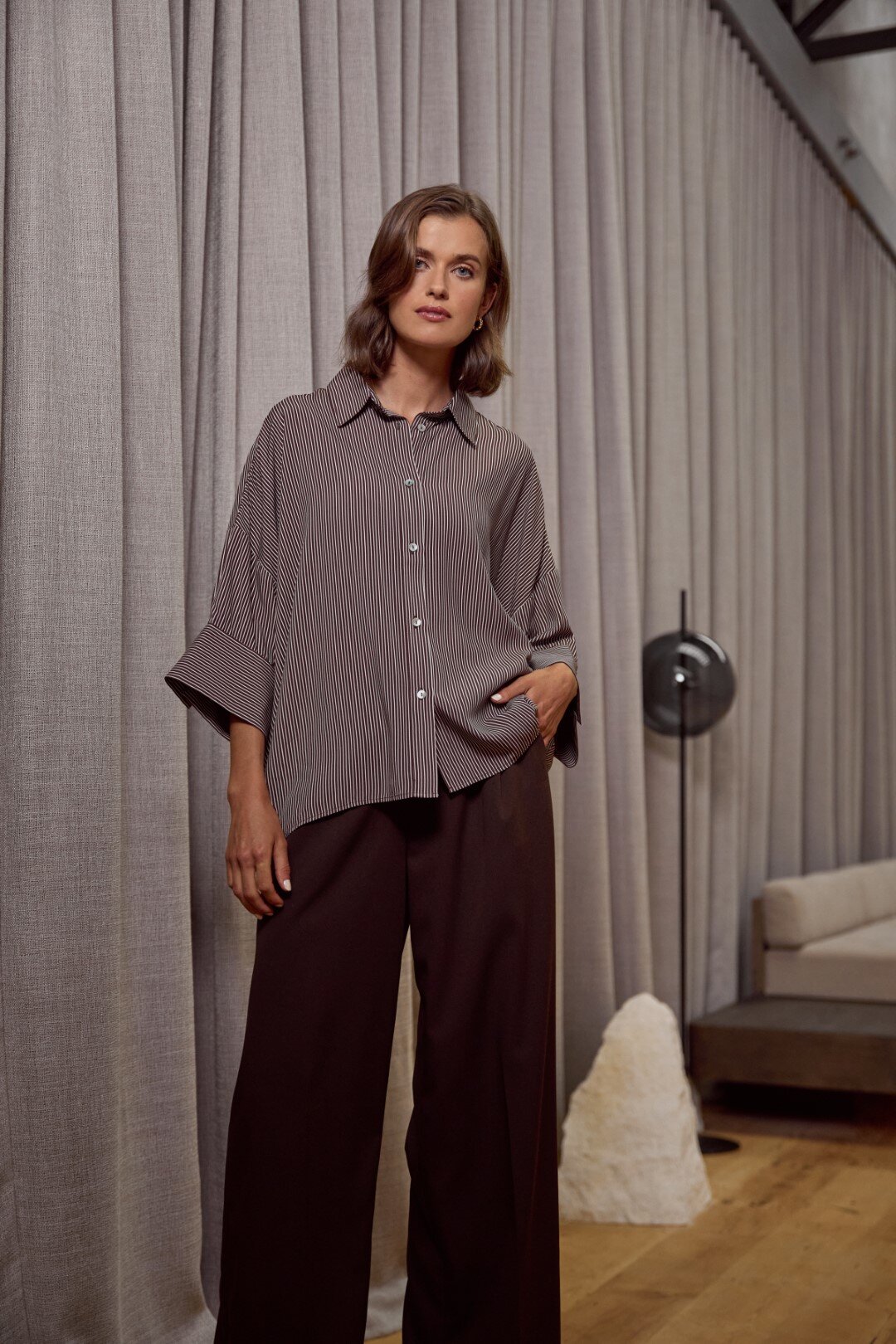 Embrace effortless Autumn styling with our Strand Shirt in Java Stripe. A contempor ary take on a classic button - up shirt, it f eatures an oversized, boxy fit with dropped shoulders and half sleeves, finished with a wide cuff. Crafted from Rayon, this shirt offers breathable comfort, with beautiful drape and a silky hand - feel. The back yok e and seam details add subtle structure and volume, and the curved high - low hem creates a flattering shape. Versatile and easy to style, wear it buttoned up for work, or open as a layering piece.