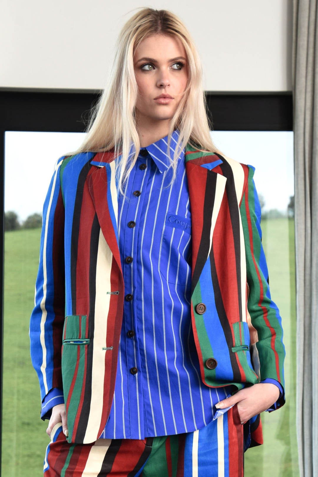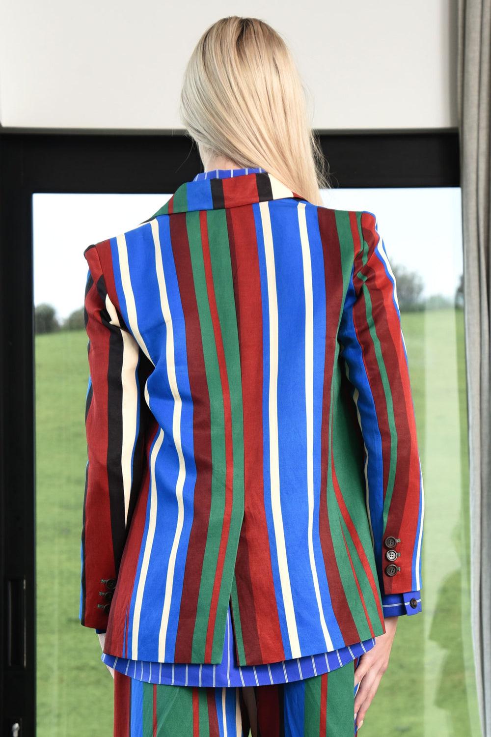 Striking stripes in bold hues give the ‘Stripe Lines’ jacket its undeniable presence, where preppy tradition meets high fashion attitude. Tailored with a contemporary edge, it features a sharp silhouette that elongates and empowers while the vibrant palette of the ‘Colour Me Impressed’ viscose linen adds a playful punch. Finished off with patch pockets and button closure, pair over denim or style with the matching ‘Walk with Me’ trousers, it’s a standout piece that balances polish with personality.
