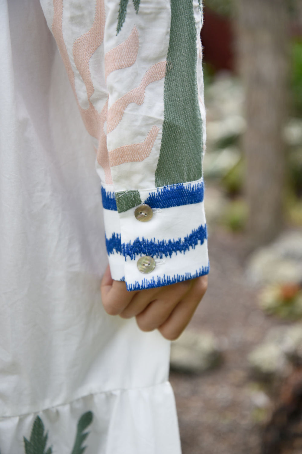 Fresh and timeless, the ‘Sway & Sunset’ dress captures effortless elegance with a Mediterranean spirit. Crafted in crisp ‘Sunset Boulevard’ cotton, it features a button-through front and softly tiered silhouette, embroidered with tropical inspired detail. A clean, airy look made for sunlit days and warm evenings.