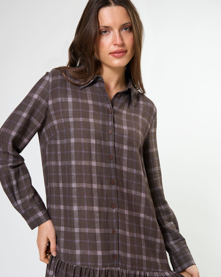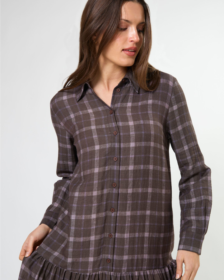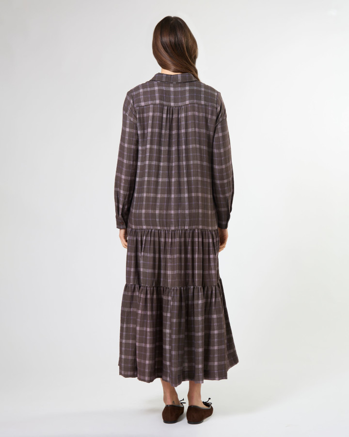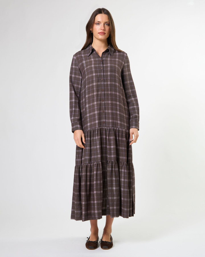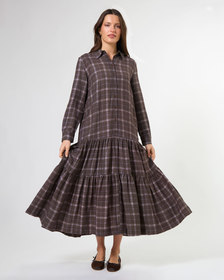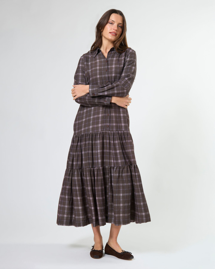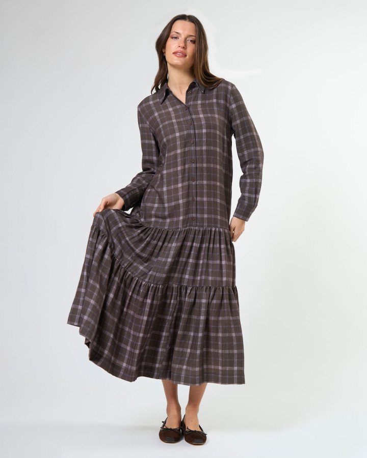 The Talia Dress Rocky Road Plaid is a midi length collared shirt dress. Featuring a drop waist design with tiered skirt detail.