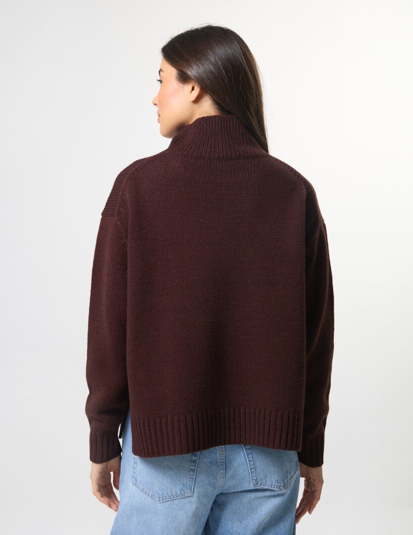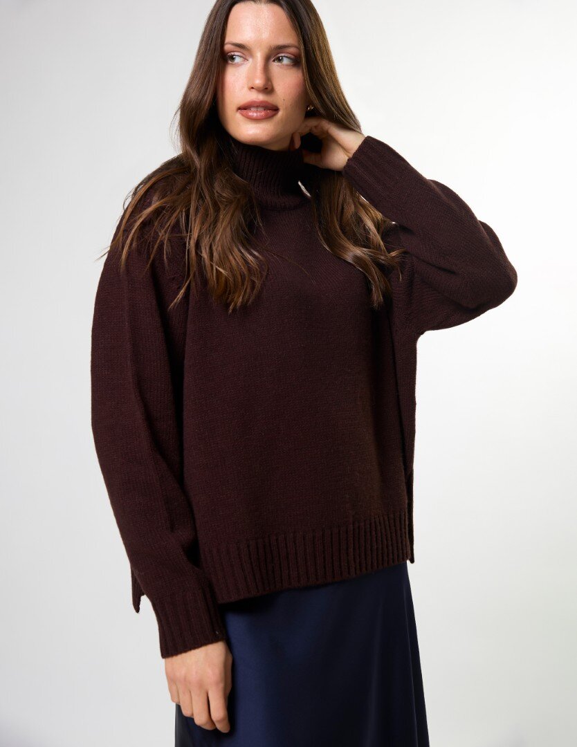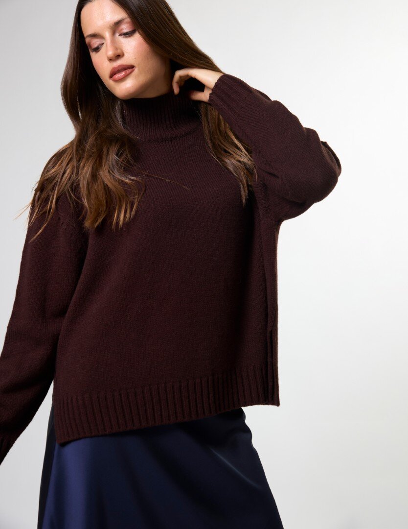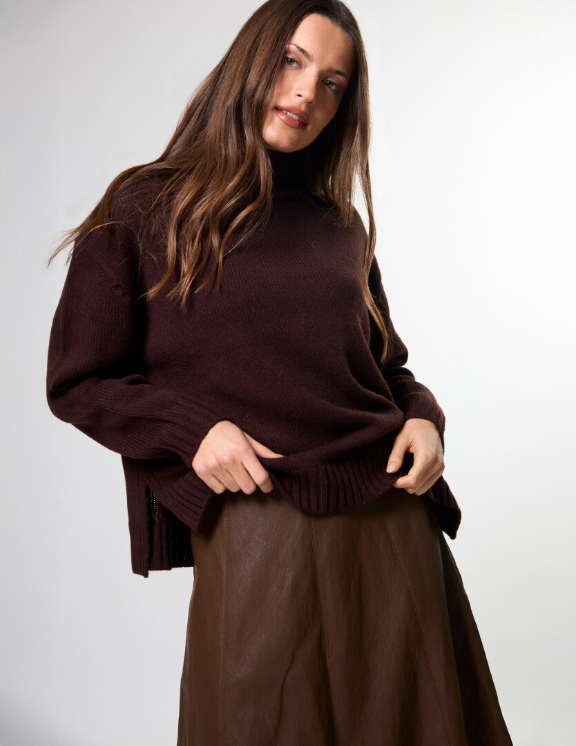 A lux new season knit with ribbed funnel neck and cuffs with a small hem side split for shaping.