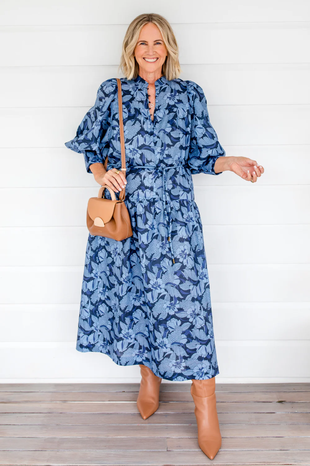 a modern classic with quiet strength. the vesper dress refines a timeless silhouette through considered detail and proportion. A deep blue floral with subtle contrast, Moonstone Garden offers a refined take on romance with a modern, darker edge.