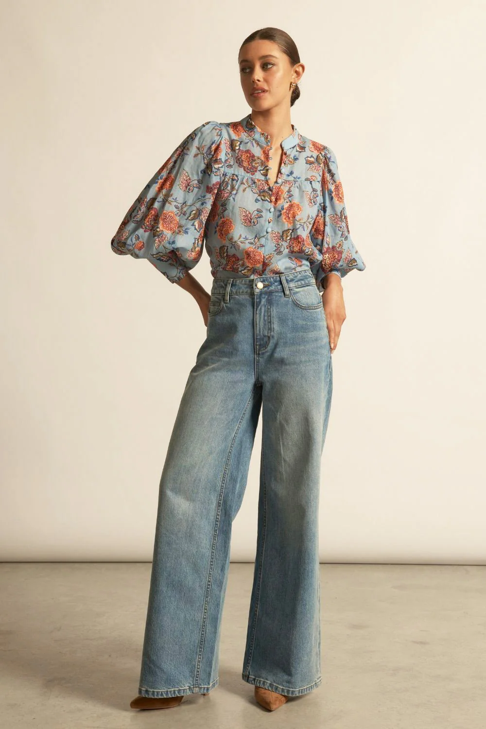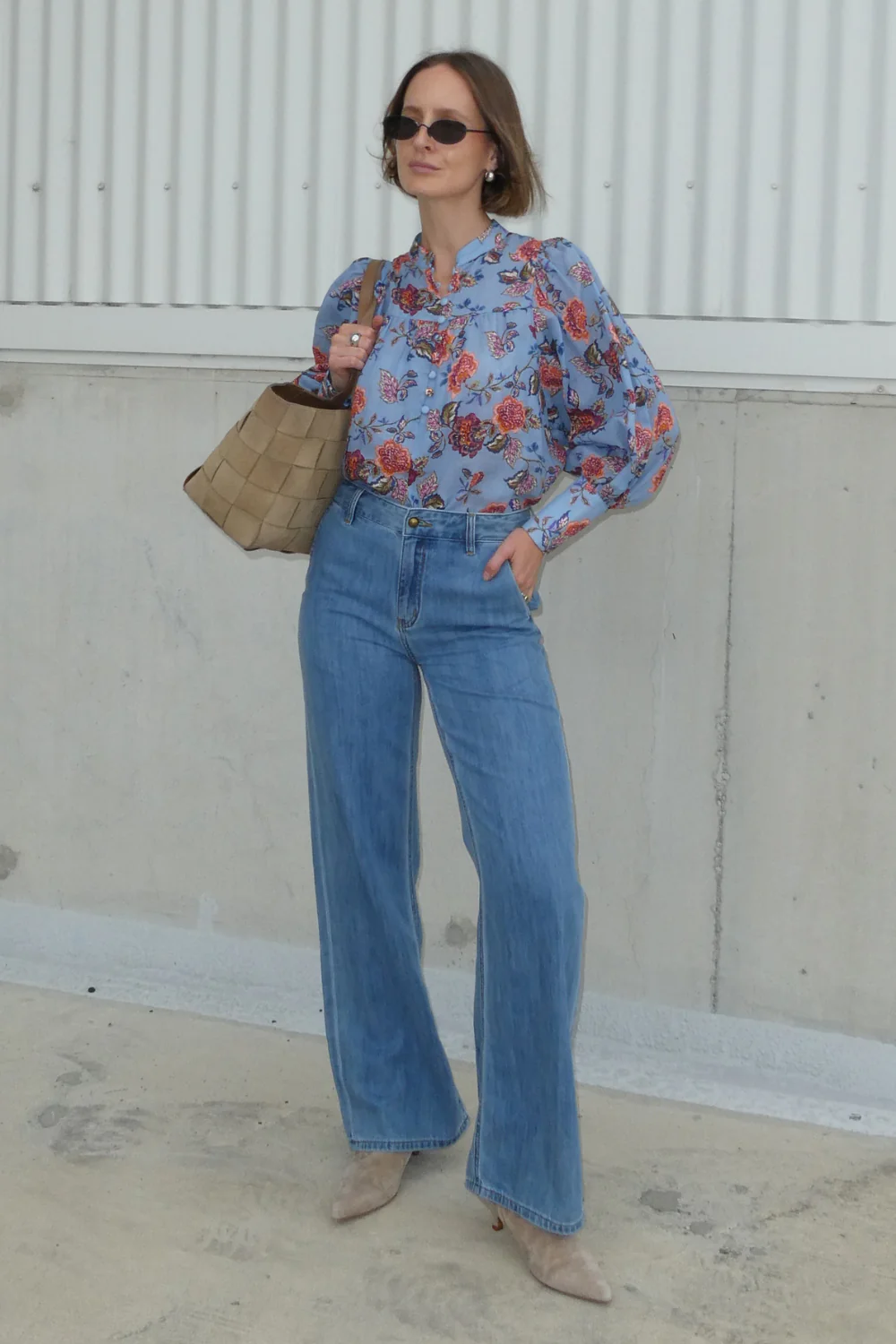 a refined transitional essential. the vista top balances softness and structure for effortless autumn–winter dressing. A cool blue base softened with warm florals, Twilight Bloom feels balanced, feminine, and easy to wear.
