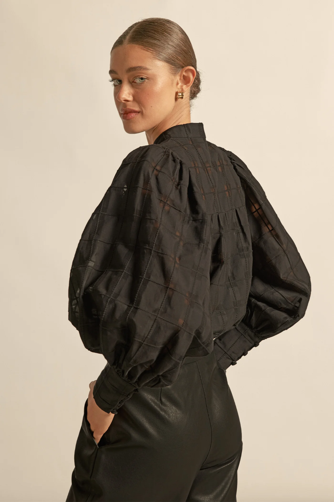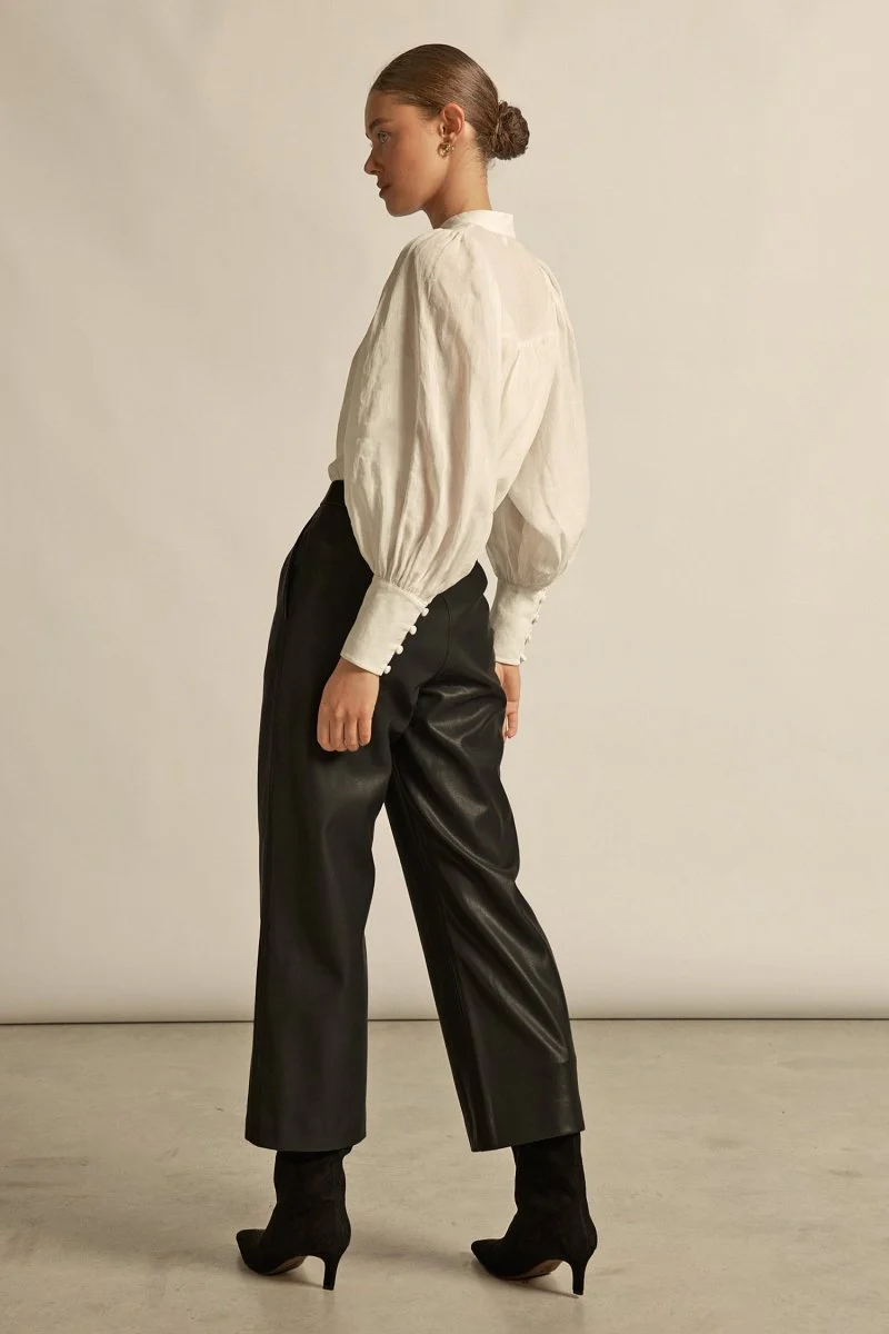 blouson sleeves finished with a deep cuff for sculptural shape