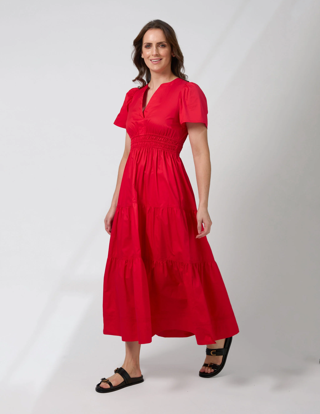 V neck tiered maxi dress with fitted upper bodice , puffed sleeves and elasticated waist