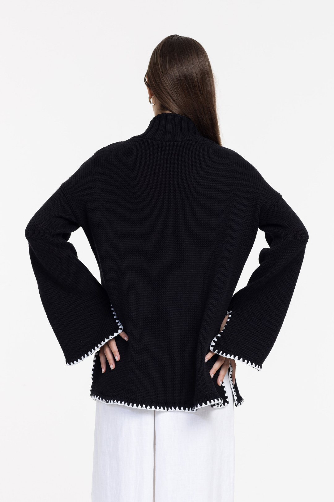 The Vogue Sweater is designed in a relaxed, easy silhouette with a softly structured high neck and wide sleeves. Contrast white blanket stitch detailing traces the hem and cuffs, adding a refined, hand-finished feel against the deep black knit.