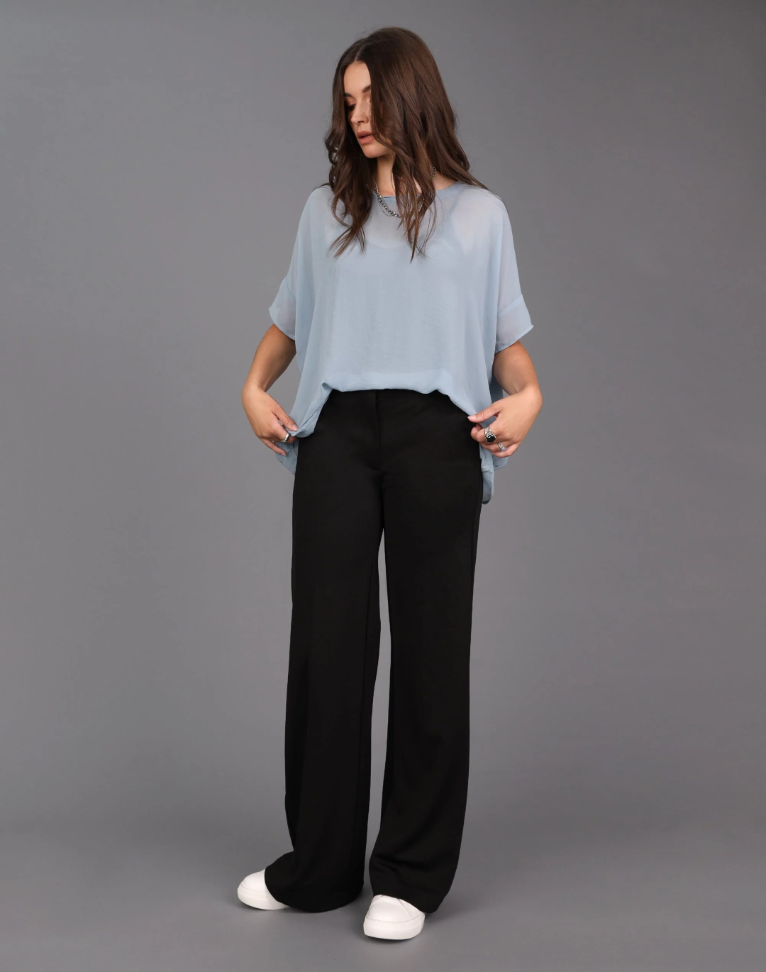 The Wide Leg Knit Tux Pant is a simple and comfortable staple that doesn’t lack polish.