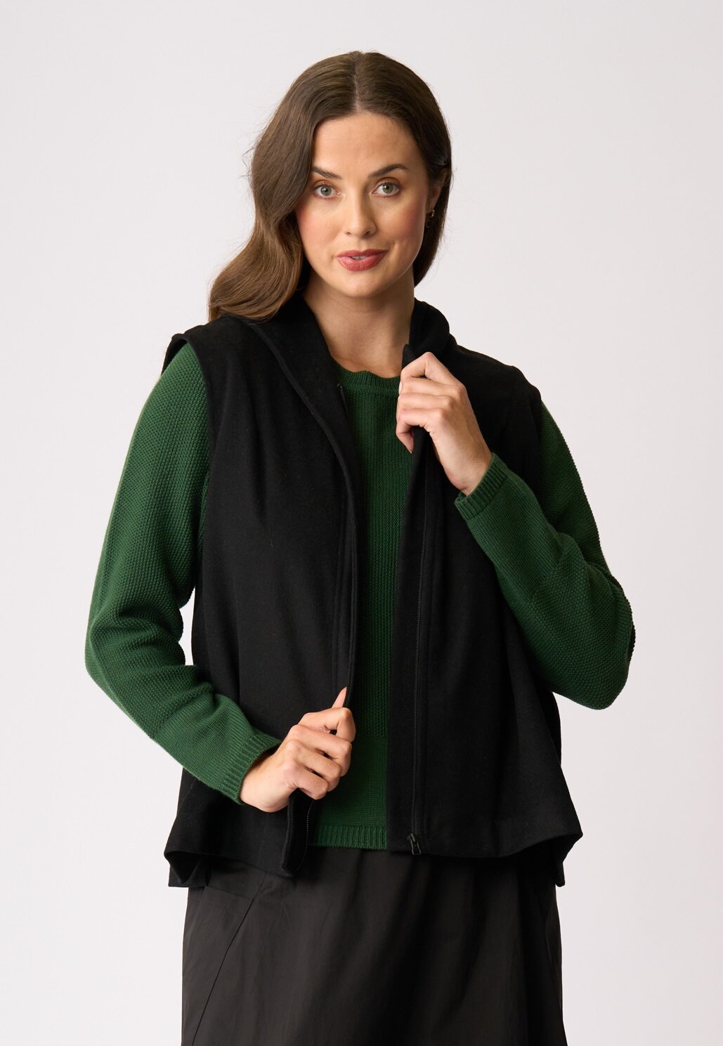 The perfect throw on layer - very casual yet very sophisticated and versatile for everyday! This vest has a hood and zip up front.