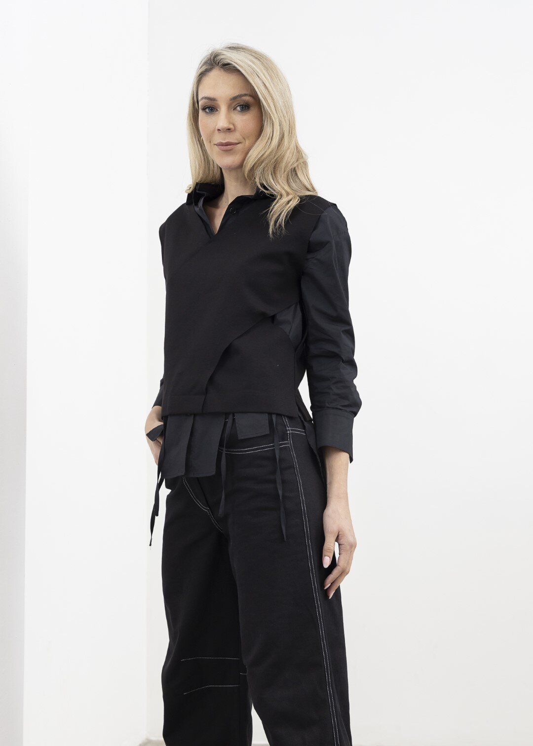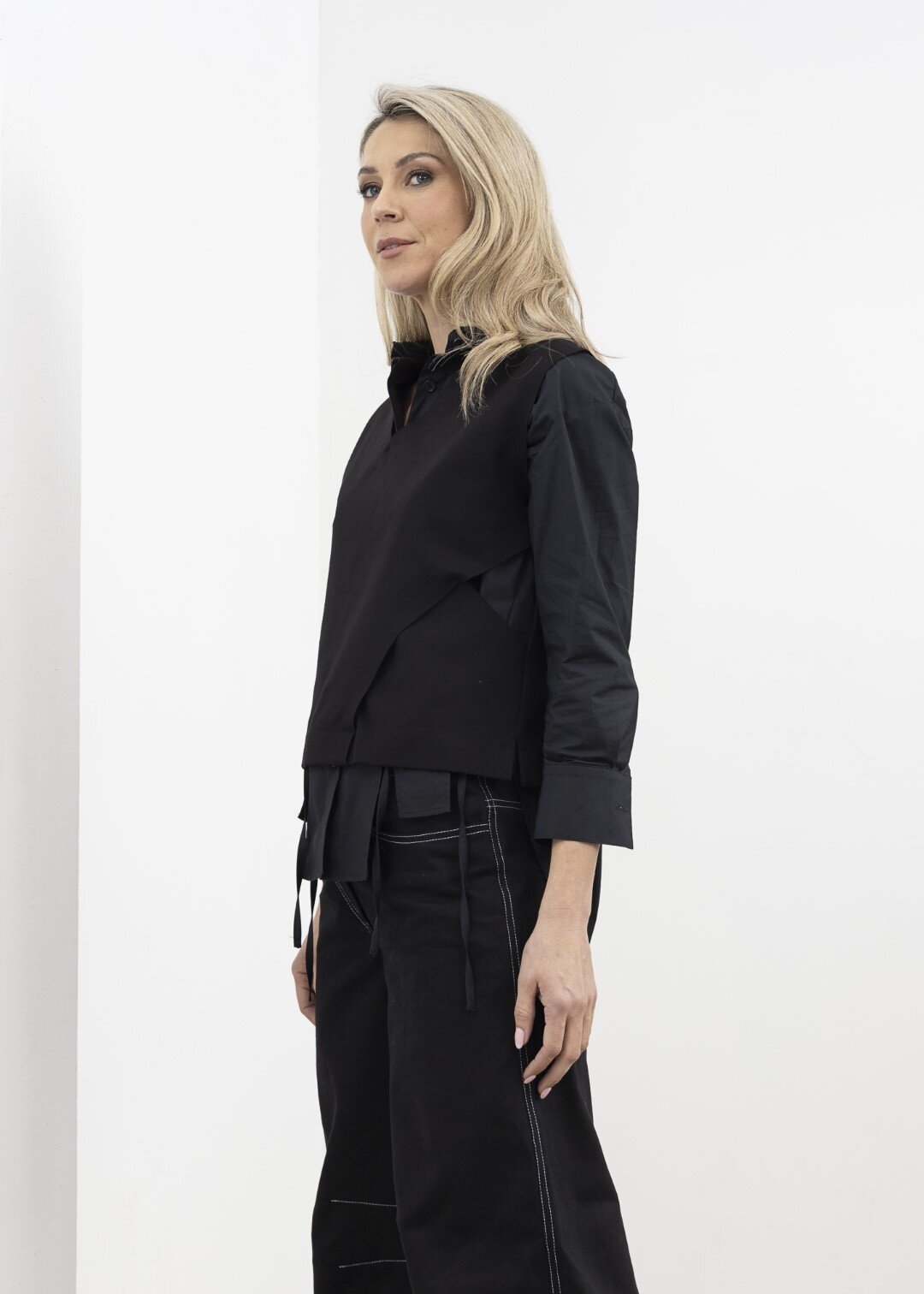 A stunning sleeveless version of the X Top - the X Vest! A striking cross-over shape with cut-out sides to for an X silhouette. Layer over your favourite basics or a crisp shirt.