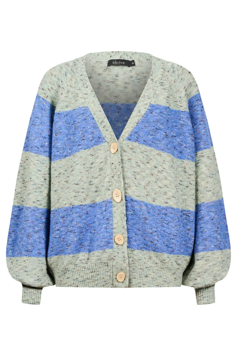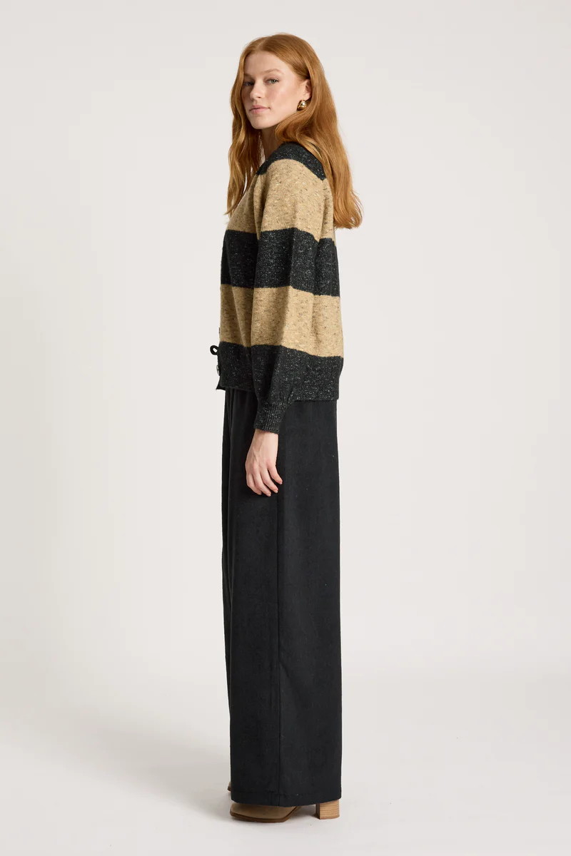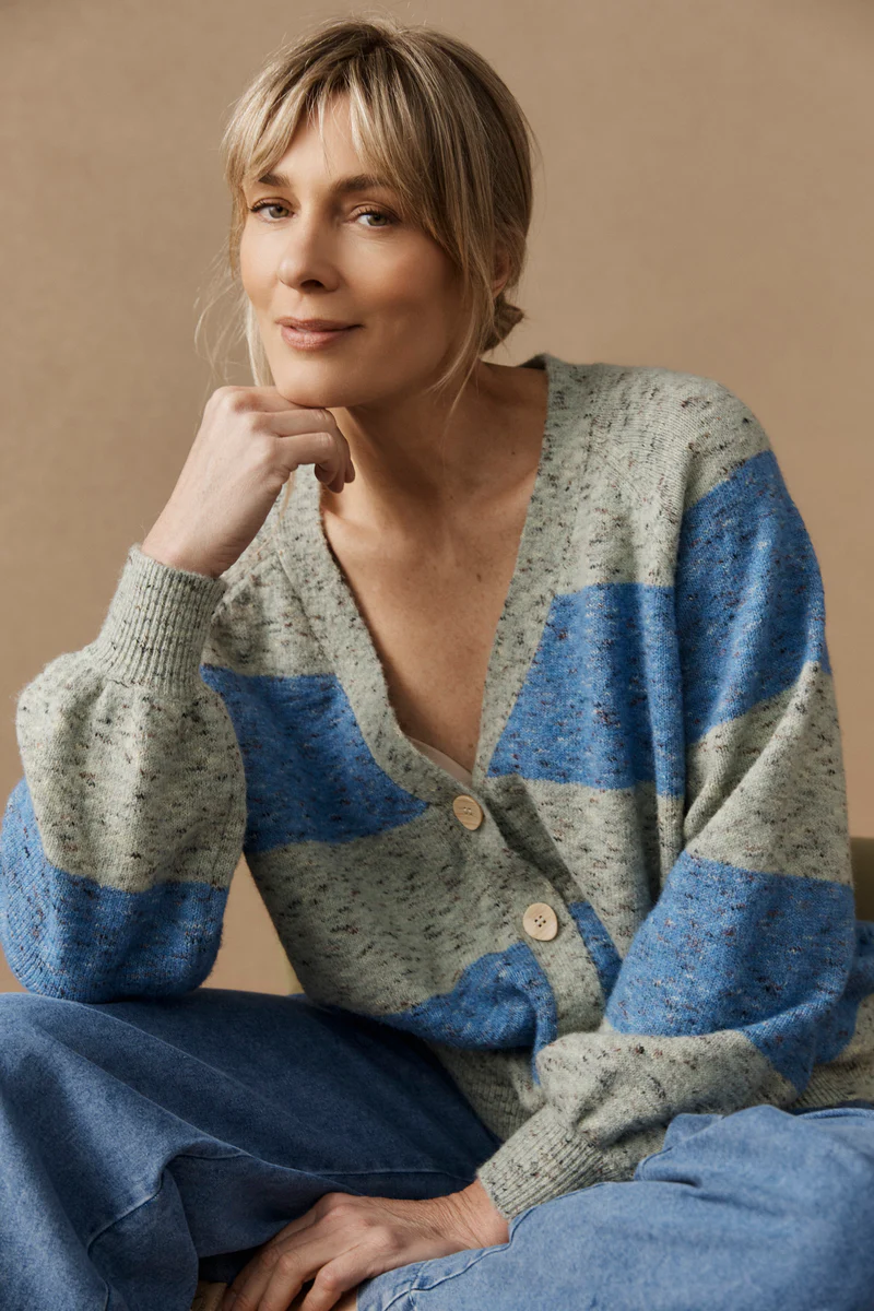 A warm wool-blend cardigan designed for cooler days. The Zarda Cardigan features a flattering cropped silhouette, V neckline and cuffed sleeves that create a subtle balloon shape. Finished with resin buttons and a two-tone stripe design woven through variegated yarn.